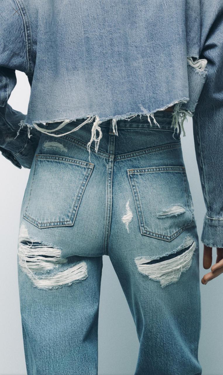 • Distressing: Ripped back pockets + hem distress for an edgy look