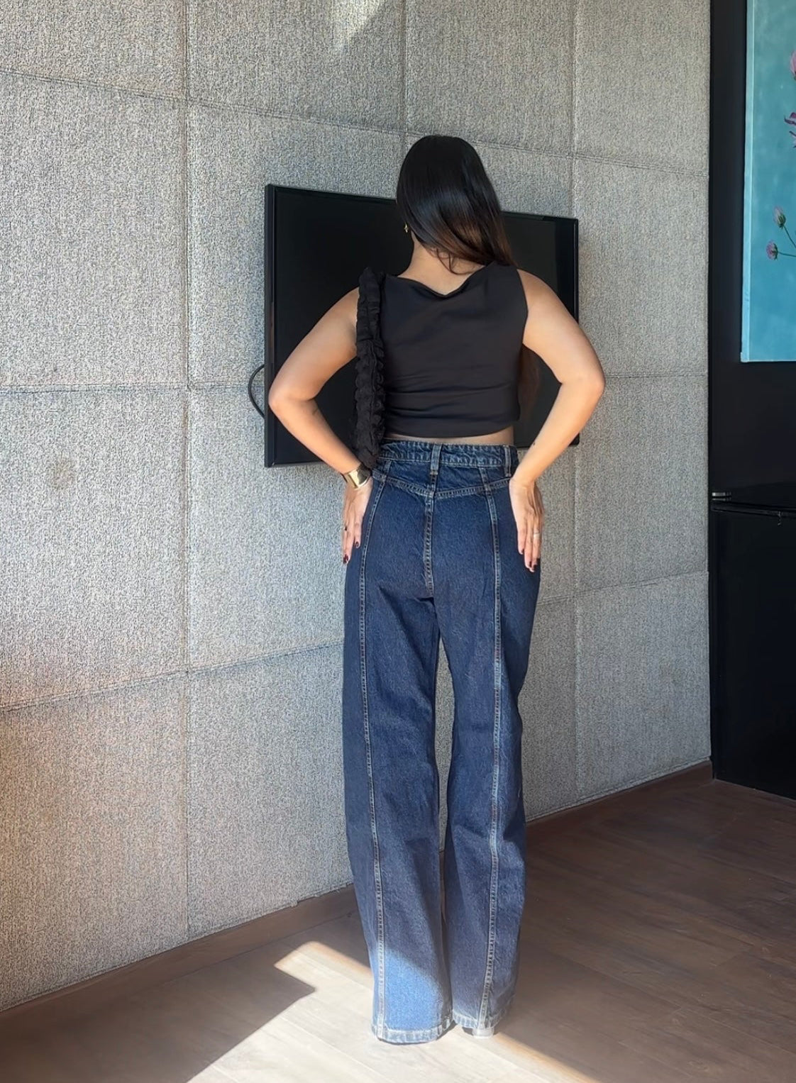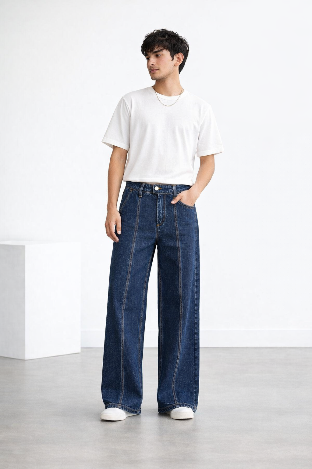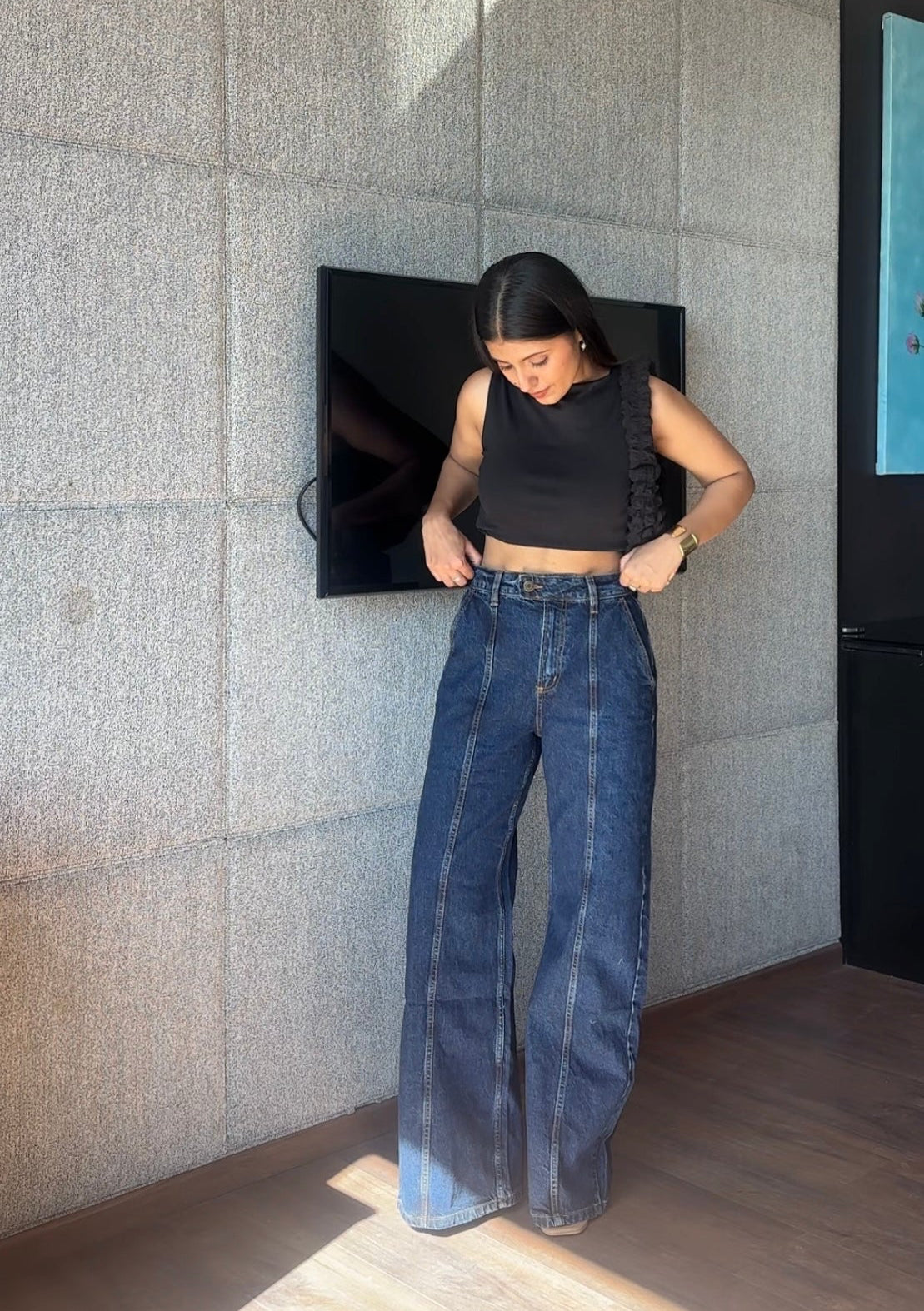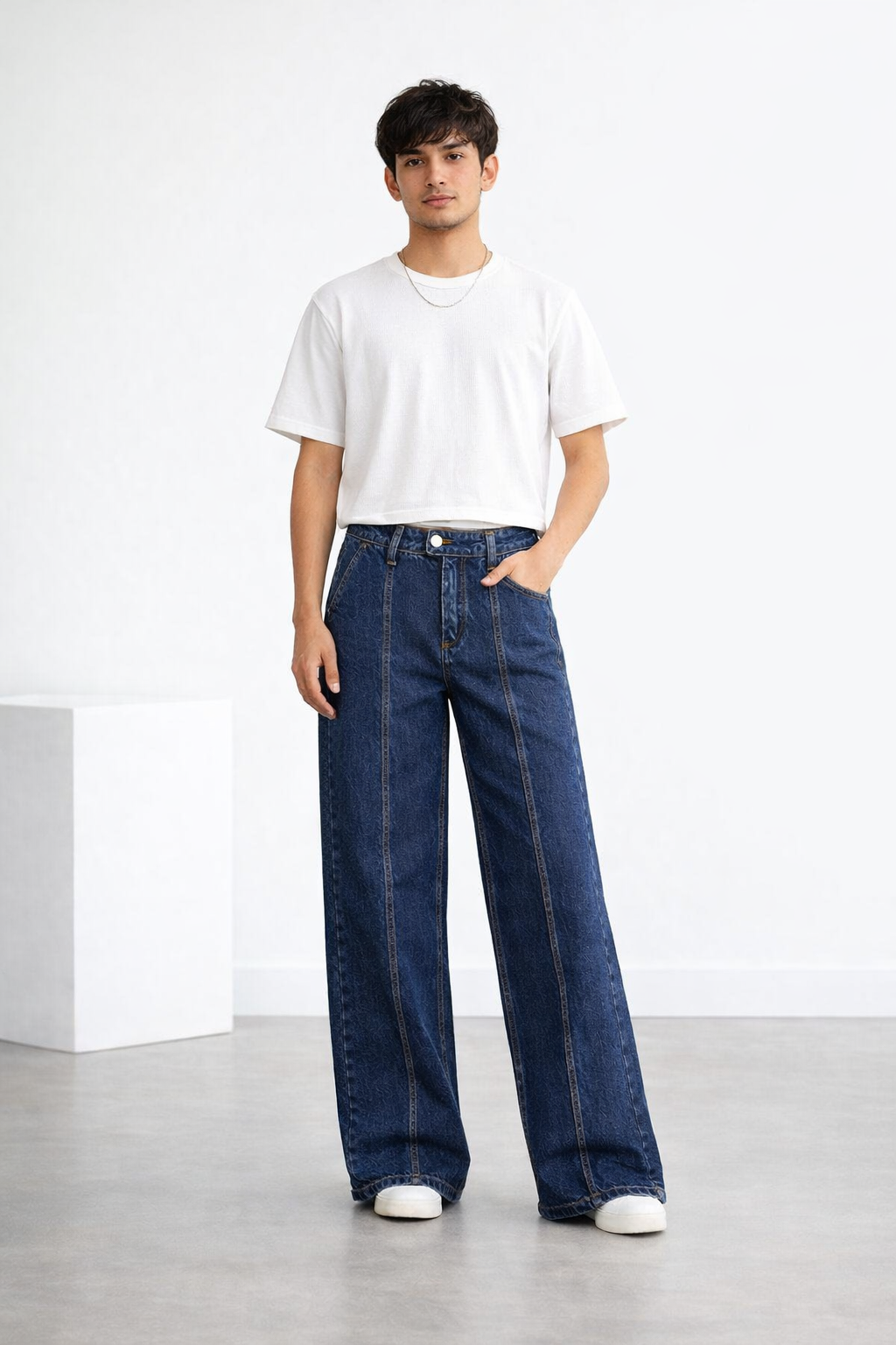 Crafted from premium denim, this pair ensures comfort, structure, and long-lasting wear. The subtle seam detailing enhances the overall shape while giving a lengthened appearance. Style it with fitted tops, cropped tees, or oversized shirts for a versatile wardrobe essential.
