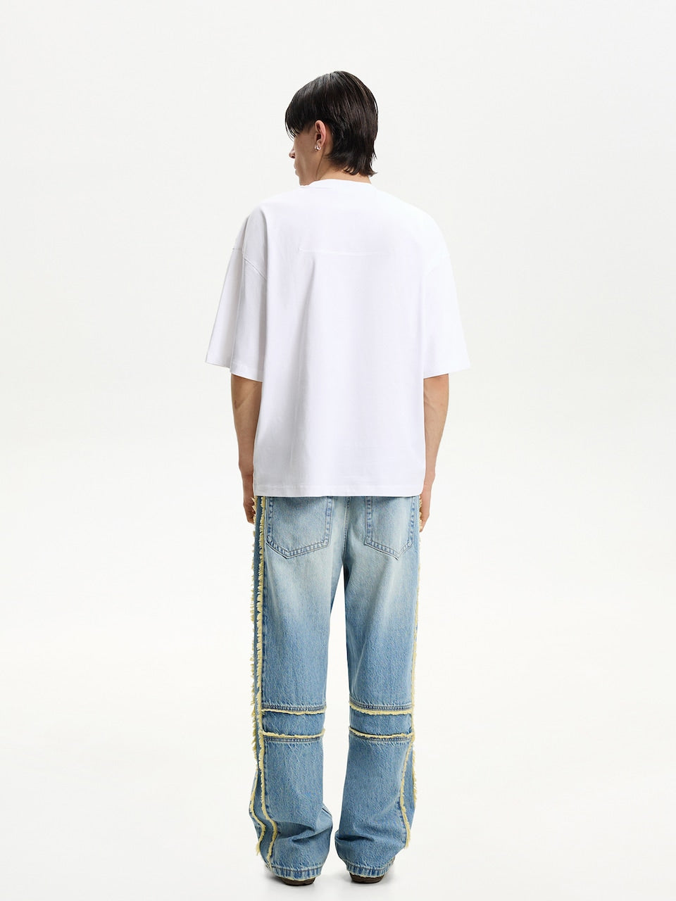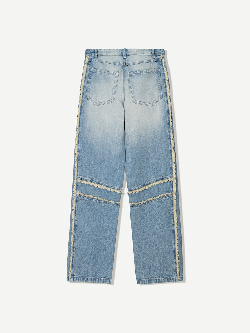 The straight wide-leg fit offers a relaxed yet structured look, making it versatile for all genders. Subtle fading through the center enhances the vintage aesthetic, while contrast panel seams running vertically and horizontally create a unique, fashion-forward design. The clean hem finish keeps the look polished and modern.