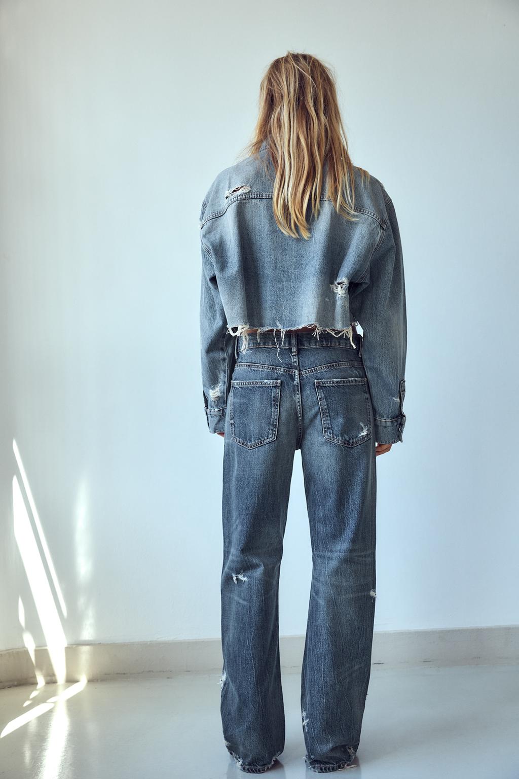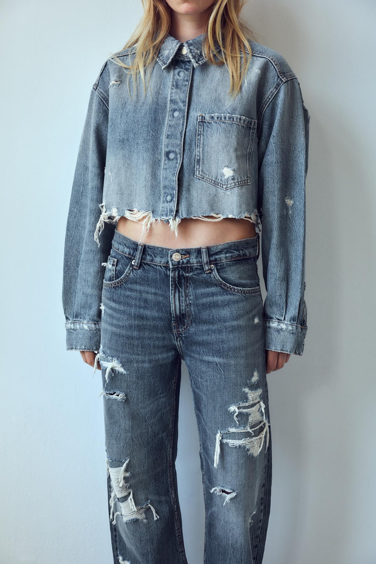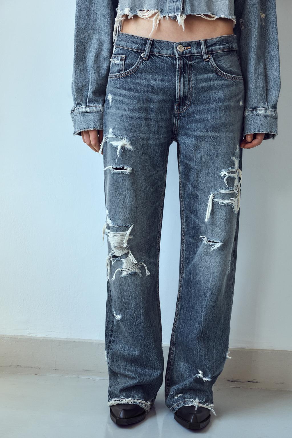 Crafted from high-quality mid-blue denim, the jeans come with natural fade lines and whiskering that enhance the lived-in look. The oversized shredded patches, frayed holes, and distressed hem add a striking rugged character while keeping the jeans soft, breathable, and wearable all day.