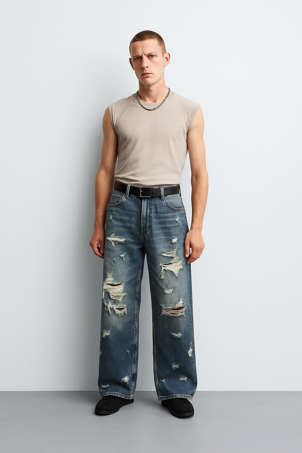 Introducing our Rugged Distressed Wide-Leg Jeans, designed for those who love a bold, street-style edge with everyday comfort. These jeans feature a relaxed wide-leg silhouette combined with heavy ripped and distressed detailing that gives a raw, vintage-inspired attitude.